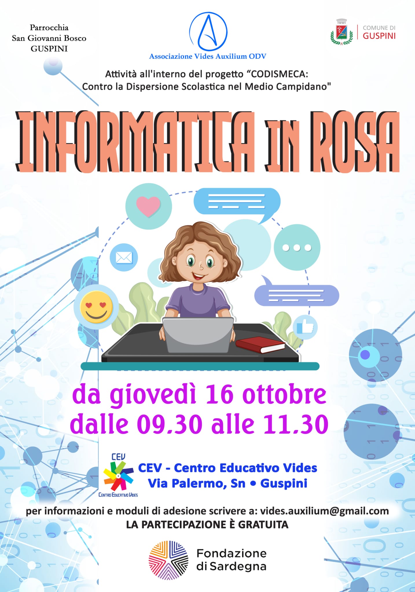 Anche quest'anno il laboratorio di "Informatica in Rosa" prevede degli incontri di apprendimento delle principali nozioni di informatica dedicati alle donne, con lezioni volte a migliorare e aumentare le competenze con lezioni sul sistema operativo Windows, la videoscrittura, il foglio di calcolo, Powerpoint, Posta elettronica, Browser e Internet e tanto altro...