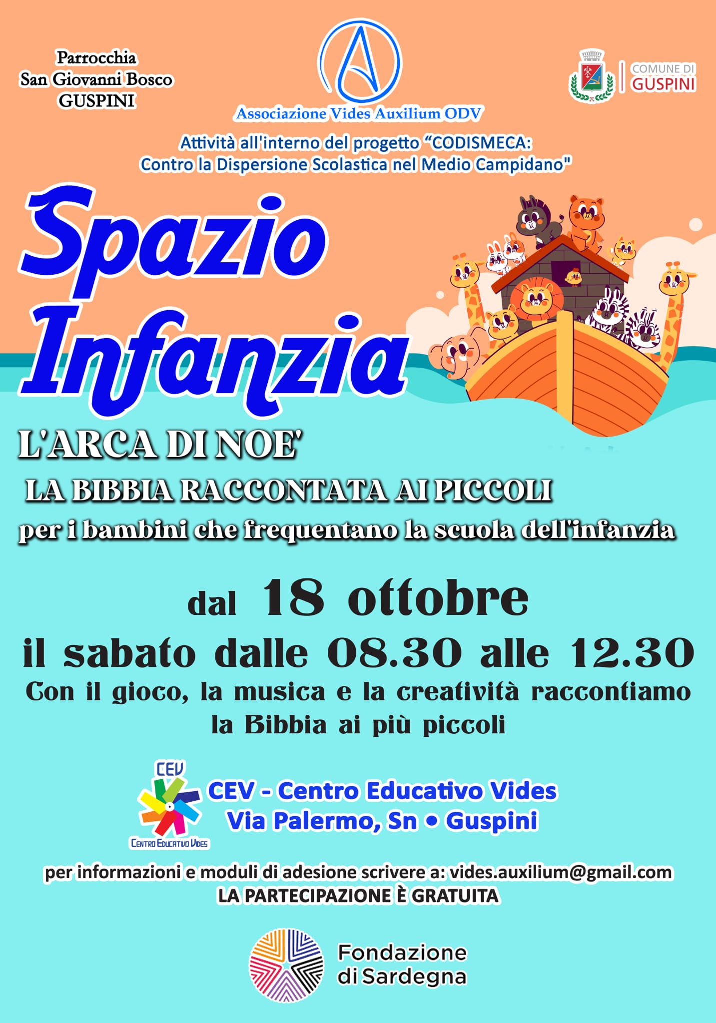 E poi il sabato mattina, a partire dal 18 ottobre, dalle 8.30 alle 12.30 vi aspettiamo con "L'Arca di Noè - la Bibbia raccontata ai piccoli" con il gioco e la creatività raccontiamo la Bibbia ai più piccoli.